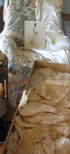 The fading of an elegant dress-satin, tulle, a fine nuptial tiara, now crumpled and old in tan tissue paper decorated with scalloped filigreed edges courtesy of Mr. or Mrs. Moth.