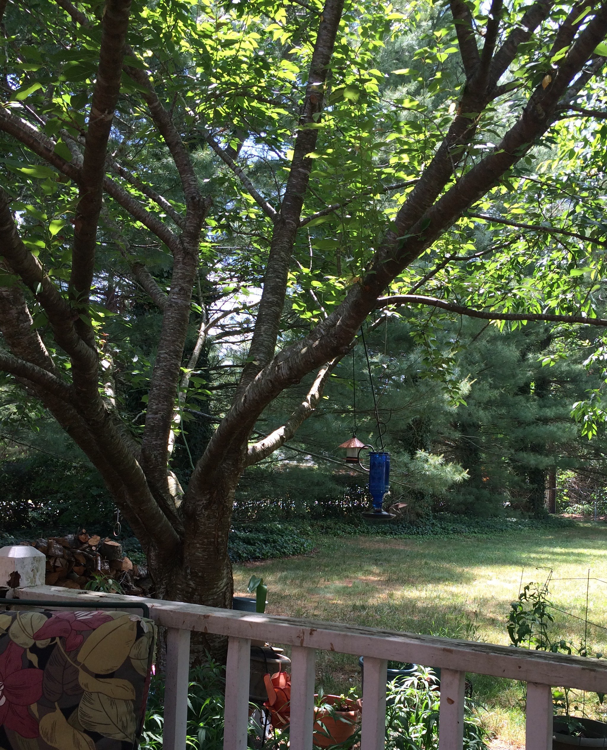 But the lovely Kwanzan cherry tree has healed, and it grows and thrives at the corner of our back porch. For now, it continues to shield us from the hottest rays of the sun and provide a haven for hummingbirds and all manner of birds and bees. And its music from windchimes is ethereal.