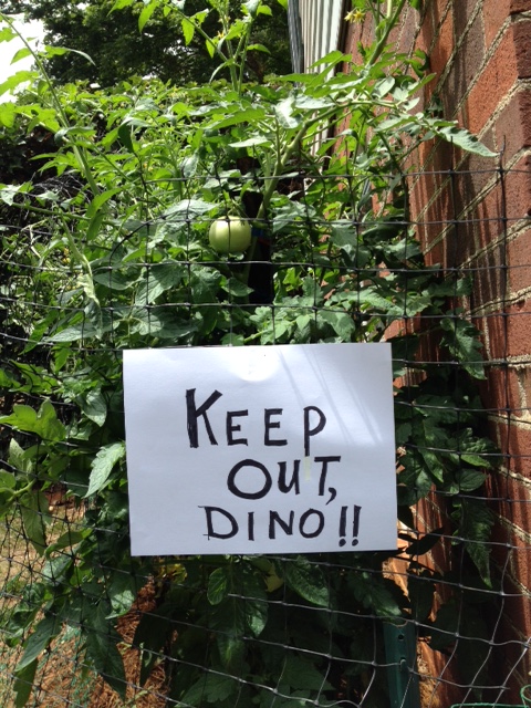 I couldn’t believe the villainous thief was a member of our very own household! Such betrayal. Such trickery. I guess I will be adding some reinforcements and height to the tomato fence, or more likely, making weekly visits to the Farmers’ Market. I’d better throw in a few extra tomatoes for Dino!
