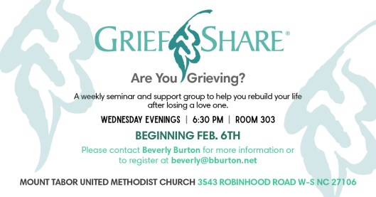 Starting FEBRUARY 6, 2019: GRIEFSHARE a weekly support group to help after losing a loved one. Wednesdays at 6:30 p.m. at Mt. Tabor United Methodist Church led by Beverly Burton. For more information, contact Beverly at beverly@bburton.net .