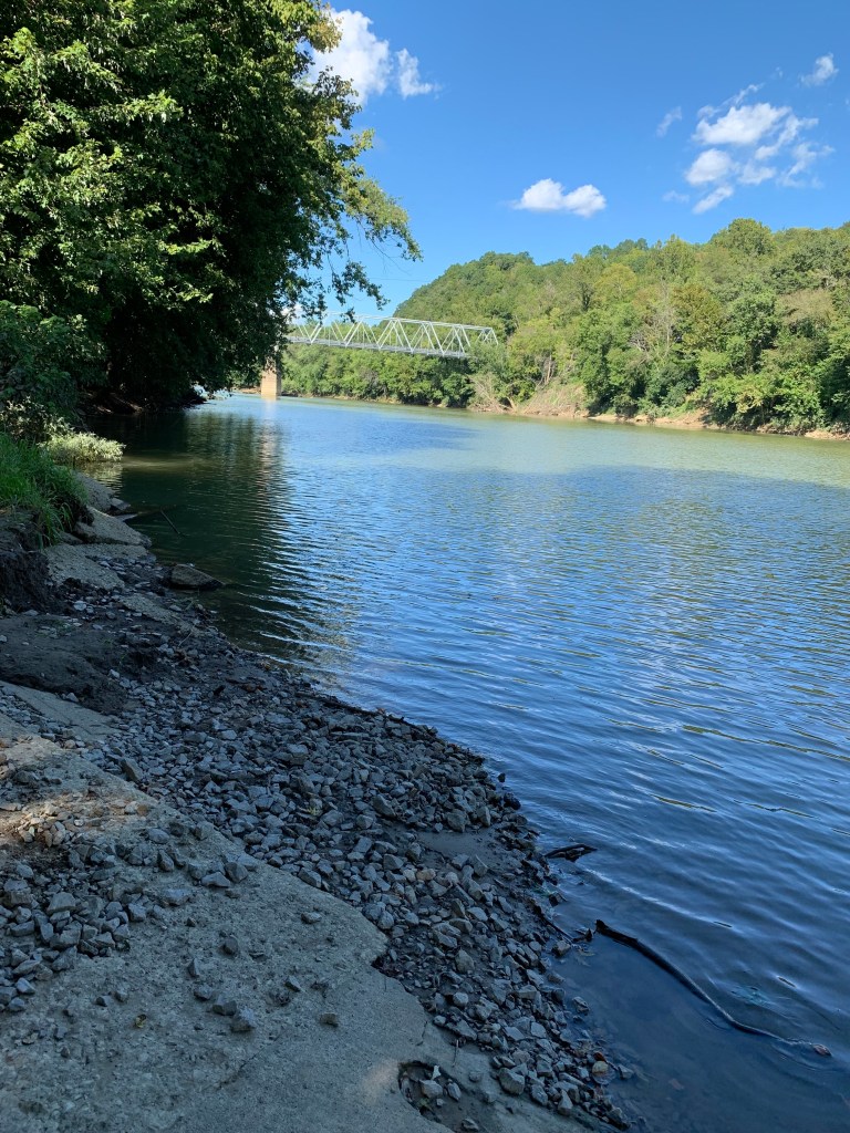 The Kentucky’s current ran swift in this spot. I figured if I entered the water I’d be swept fast down river, under a mammoth bridge, and who knows if I’d be able to make my way back to the landing. The water wasn’t inviting, brownish with parts of several swamped tree branches above the surface. I nixed the idea and settled instead to collect some river water in the little bottles Dottye had brought along. For what purpose? Ah, just to have them. To water our favorite shrubs or potted plants when we got home—blessings or baptisms from our trip?