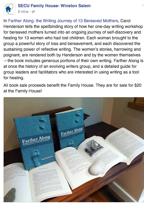 If you live in Winston-Salem, Charlotte, Raleigh-Chapel Hill or Wilmington areas of North Carolina or in northern Virginia, you can contact any of the women in the writing group to purchase a copy directly from any of them. Proceeds go to the SECU Family House in Winston-Salem, the hospital hospitality house. See http://www.familyhousews.org